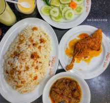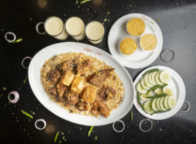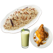 Kacchi (Basmati), Chicken Roast, Jali kabab, Beef Rezala, Borhani, Jorda/Firni, chutney, Salad.