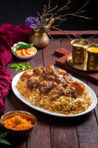 Kacchi (Basmati), Chicken Roast, Jali kabab, Beef Rezala, Borhani, Jorda/Firni, chutney, Salad.